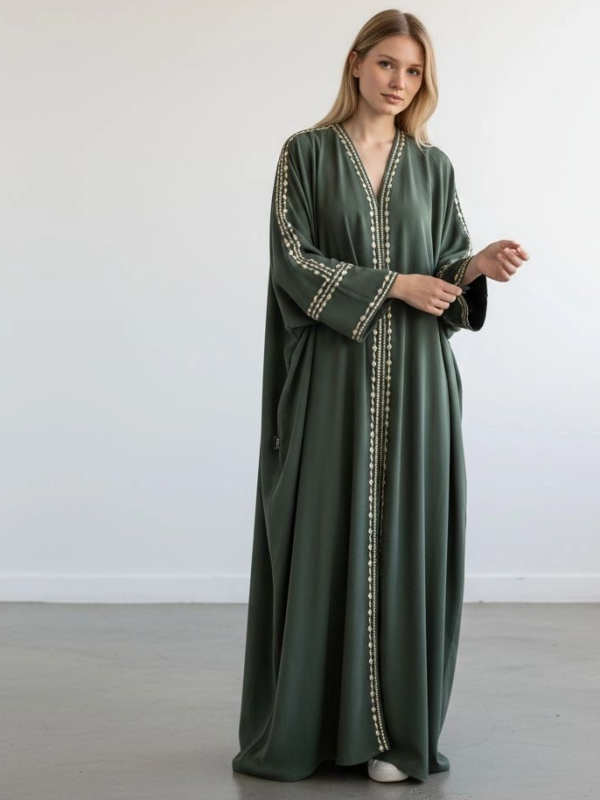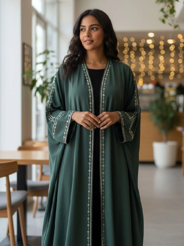 اللون: أخضر زمردي عميق، يضفي حضورًا ملكيًا وهادئًا. - التطريز: زخارف فضية دقيقة على الأطراف والأكمام، تضيف لمسة فنية راقية. - القصّة: نص بشت -